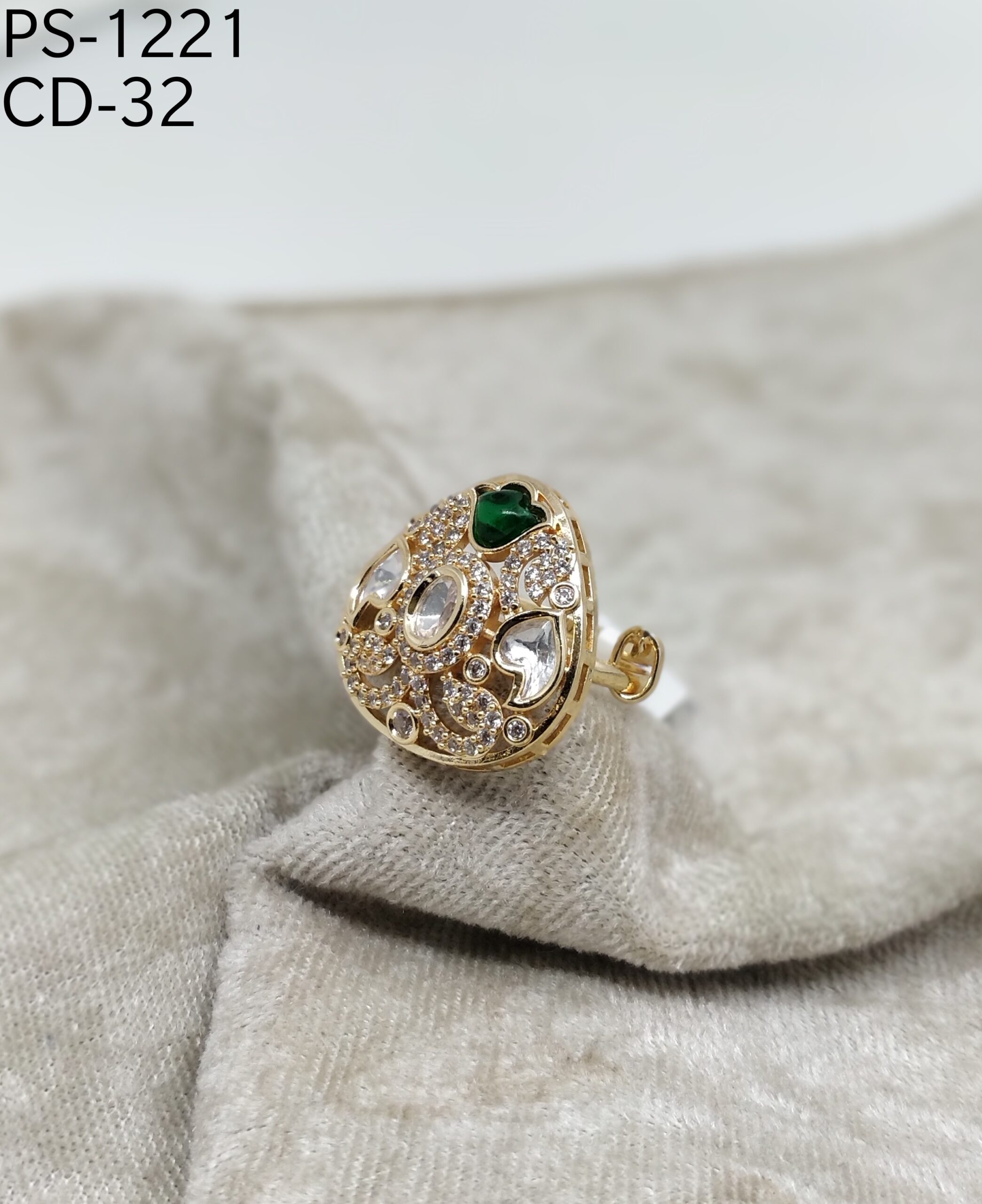 Elevate your style with this exquisite teardrop-shaped statement ring, crafted in a luxurious gold finish. The intricate design features a dazzling mix of sparkling white stones and a striking green gemstone accent, creating a perfect balance of elegance and charm. The bold yet graceful pattern adds a touch of sophistication, making it an ideal choice for festive occasions, parties, or as a standout accessory for everyday glamour.
