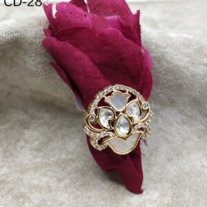 - Overall Style: The ring combines the vibrant, traditional artistry of meenakari with the raw, sparkling clarity of polki, resulting in a unique and elegant piece of jewelry.