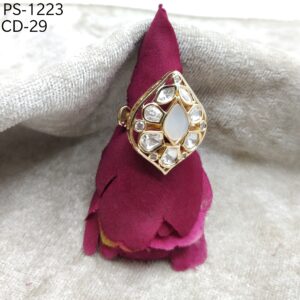 - Additional Stones: The polki stone is set in an ornate, toned metal and is surrounded by a halo of smaller, clear stones that enhance its brilliance.