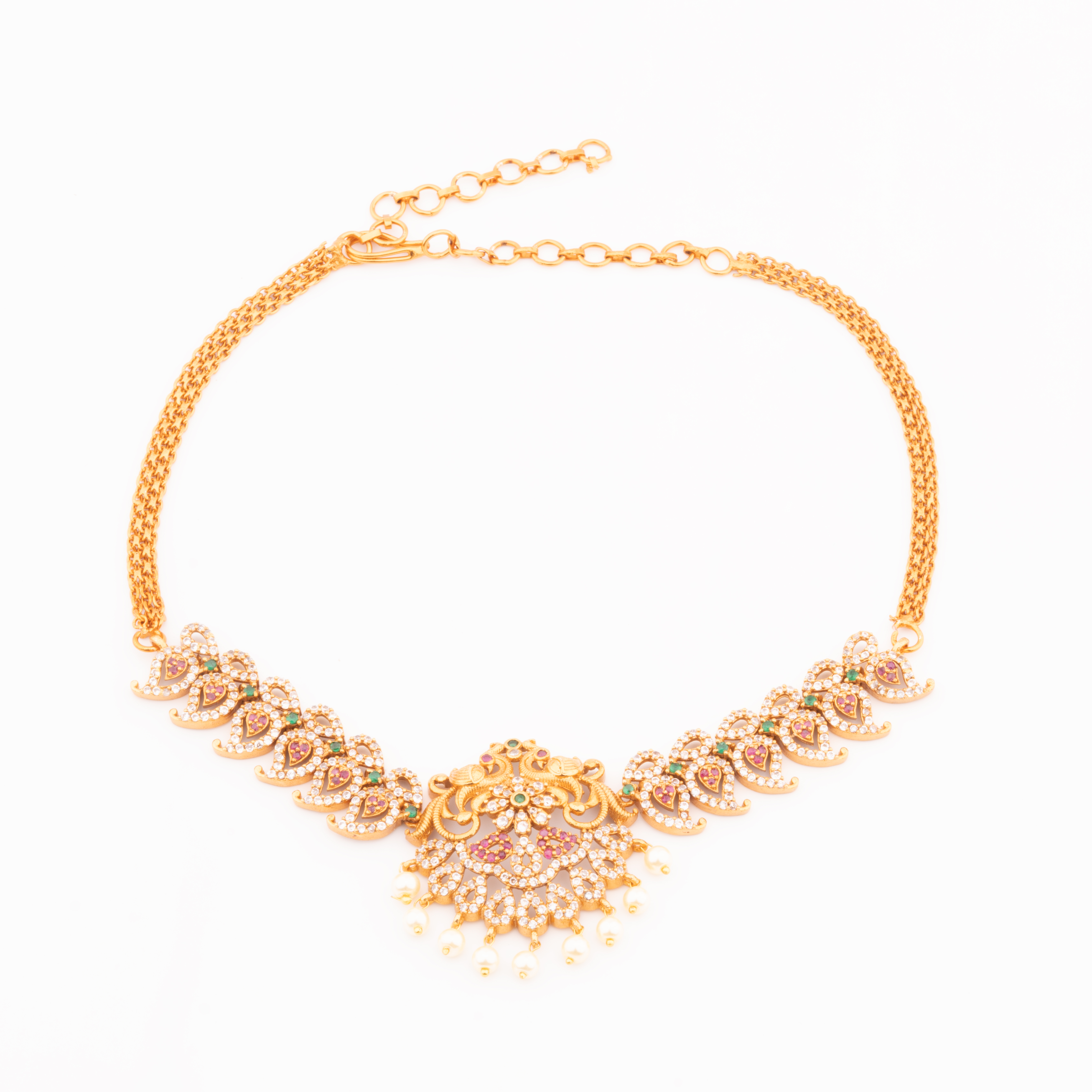 To preserve the beauty of your Rajwadi Temple Choker Set, avoid exposure to water, perfumes, and harsh chemicals. After use, clean gently with a soft, dry cloth. Store in a padded jewelry box to prevent scratches and tarnishing.