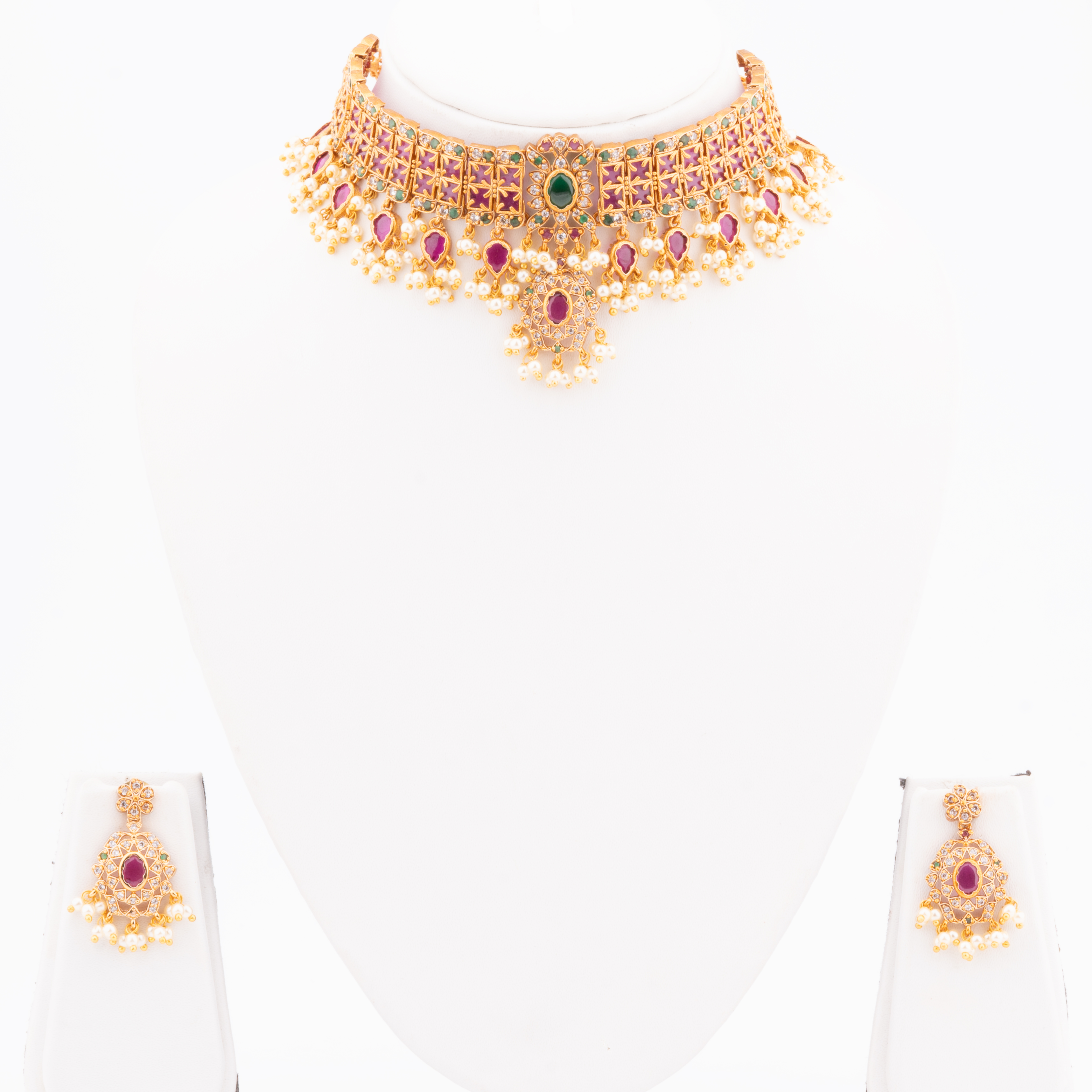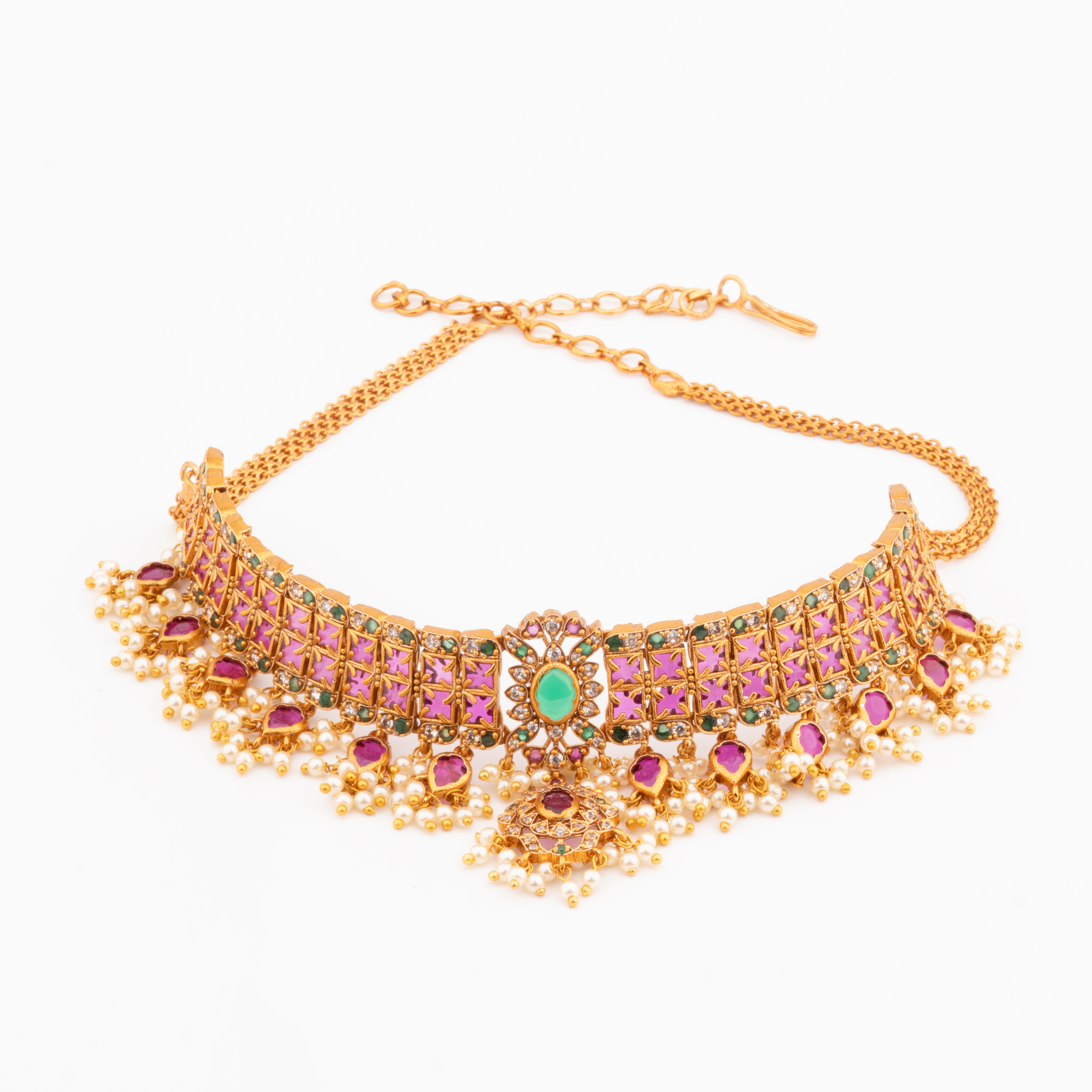 Step into the grandeur of tradition with our Rajwadi Temple Choker Set, a masterpiece inspired by the opulence of Indian royalty. This exquisite choker set features intricate temple-inspired motifs adorned with lustrous gemstones and antique gold finishes, capturing the essence of cultural heritage. Paired with matching earrings, this set is perfect for weddings, festivals, and celebrations where elegance meets tradition.