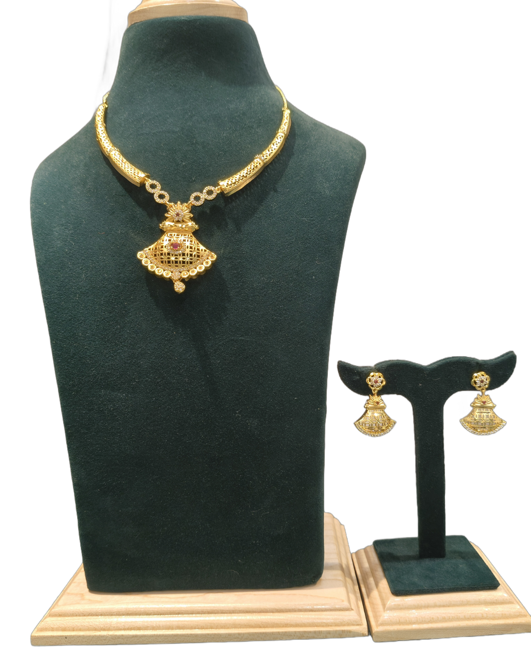 Inspired by temple sanctums, this set features a sacred bell (ghanta) pendant – symbol of divine awakening in Hindu and Buddhist traditions. The pendant showcases intricate etchings of lotus petals and Om motifs, with a tiny clapper that moves gently. Matching bell earrings complete this spiritual ensemble.